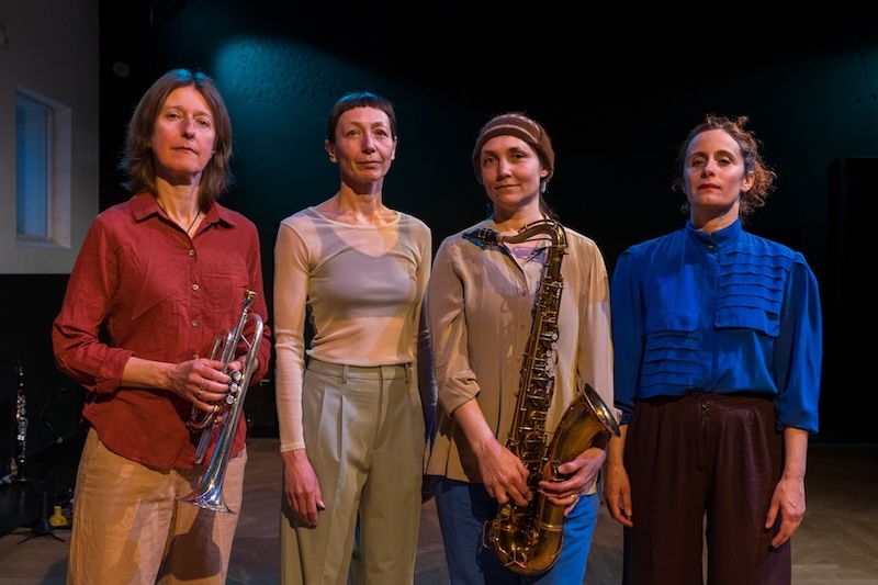from left to right: Felicity Provan: cornet, vocals, small instruments; Lily Kiara: dance, voice; Barbara Pereyra: dance, voice; Ada Rave: saxophone, clarinet, small instruments | photo by Guido Vrebos